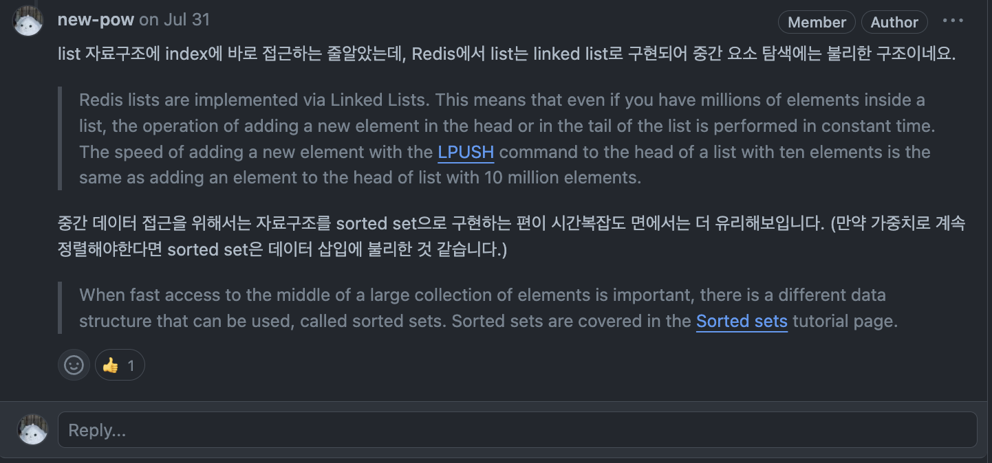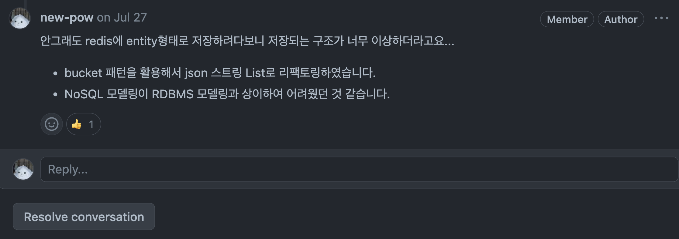 해당 코드에 대해서 당시 리뷰어에게 코멘트를 받고 Redis Repository를 쓰는 것을 포기하였습니다.