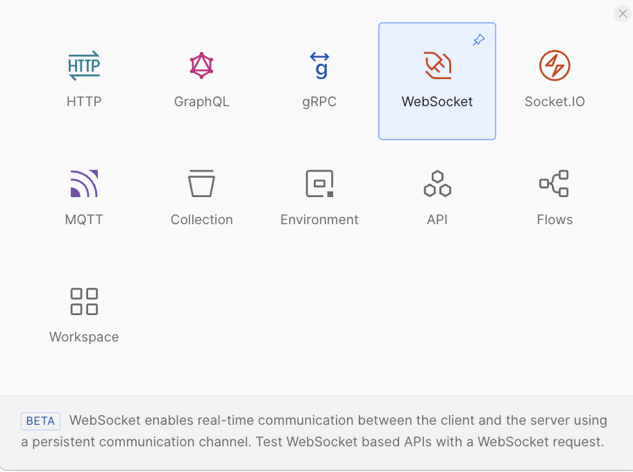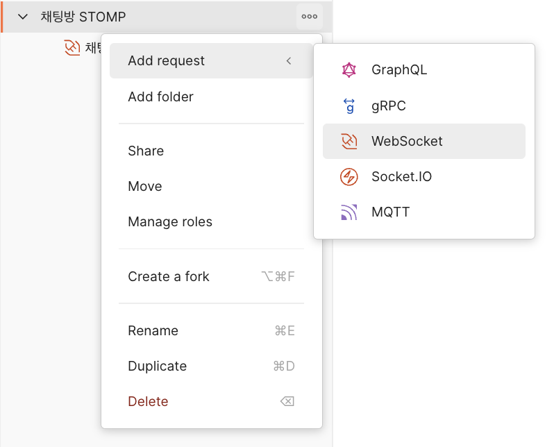 포스트맨에서 요청을 생성할 때, 기본으로 생성하면 `HTTP` Rest API 생성을 하는데요. 저 위에 New를 누르고 `WebSocket` 요청을 생성해주고 이를 저장할때 새로운 콜렉션을 만들어주면 다른 HTTP 프로토콜 외 프로토콜 요청을 위한 콜렉션을 따로 만들 수 있었습니다.