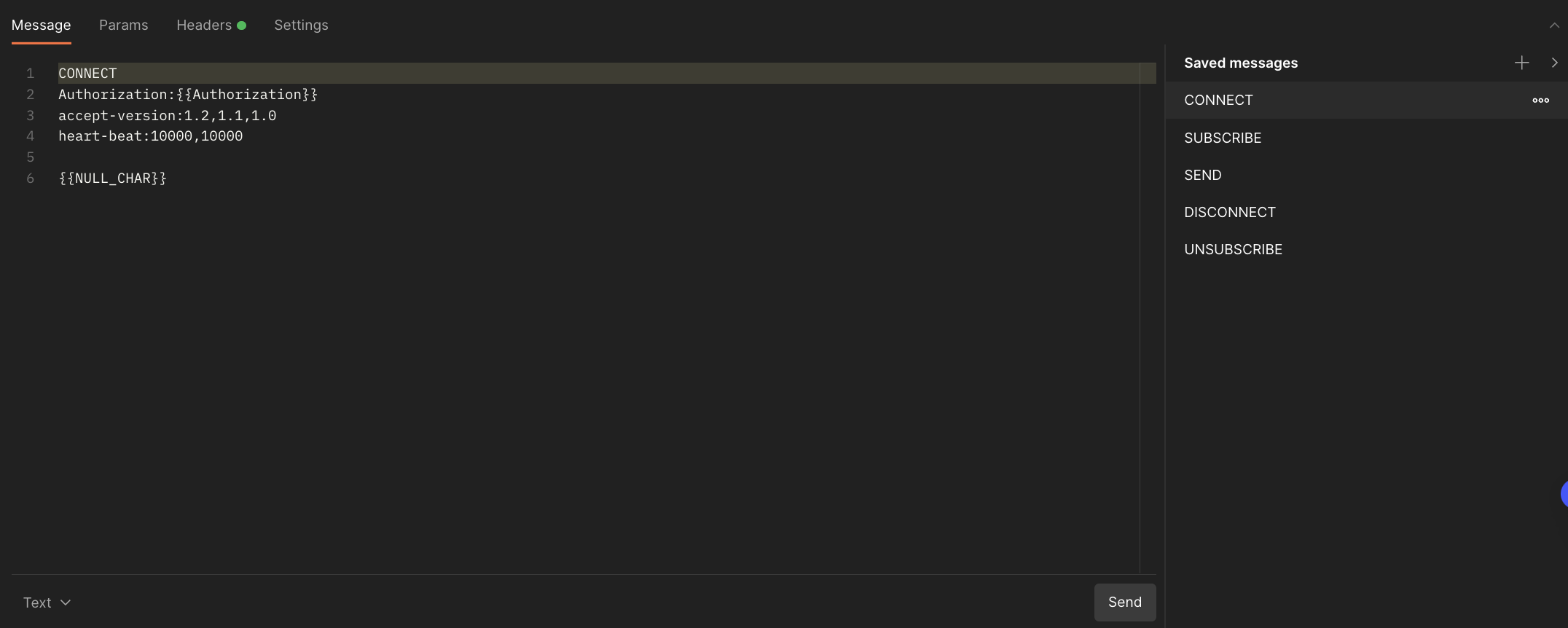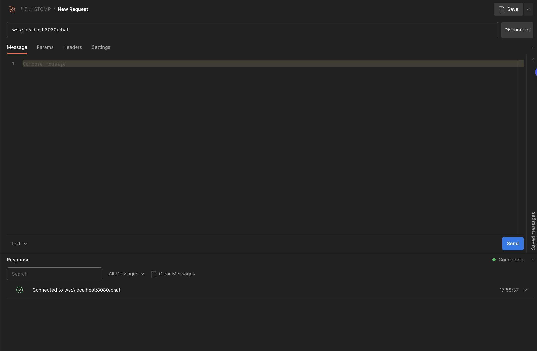 Postman으로 테스트를 하기 위해서는 웹소켓 통신을 `connect`하고 STOMP 의 형식에 맞게 메시지만 보내주면 되었는데요.