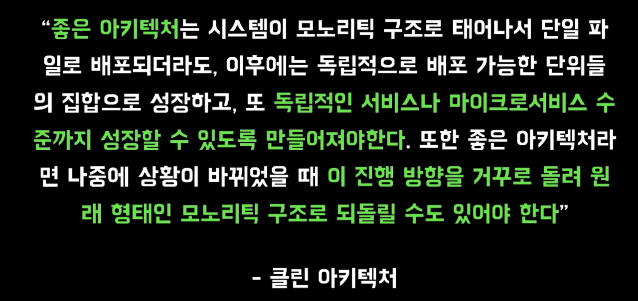 다만 단점으로는 시간이 지나고 서비스 규모가 점차 커지면 코드를 관리하기 어려워집니다. 새로운 기술을 활용하고 기능을 구현하거나 개선할 때 고려해야하는 것이 많다는 단점이 있습니다.